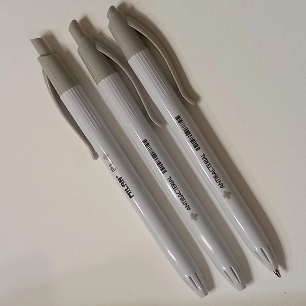 Le corps du stylo inclut un biocide. Le biocide est un verre au phosphate d’argent (CAS 308069-39-8) avec effet antibactérien. Idéal pour améliorer l’hygiène à l’école, au bureau, dans les espaces en contact avec les aliments et les environnements sanitaires.