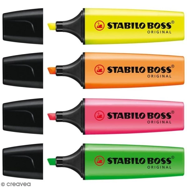 Ces surligneurs Stabilo Boss Original, de coloris assortis, sont des incontournables du bureau et votre trousse de travail. Avec leurs couleurs fluos éclatantes, ils vous permettront de mettre en lumière, les informations écrites importantes avec leur pointe large.